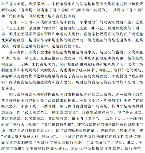 宋代财政性市场和自发性市场同时并存且秉持不同逻辑,构成市场二元结构。两种市场在宋代都达到了高峰,因官民共利分利机制的建立而彼此关联,相互推动,并非此消彼长的对立关系。财政性市场虽居于主导地位,但自发性市场也并非内存于财政性市场之中,或尚未发展起来,甚至因财政性市场发展而萎缩,而是同时出现制度重大新变,规模空前增长。一方面,两种市场特点和逻辑沿袭了汉武帝以来的传统。另一方面,宋朝改变了汉武帝至唐中叶在禁榷品市场主要通过国家独占经营、拒斥商人实现“权轻重”“收利权”的方式,而采取更为实用和功利的“权商贾”方式,以山泽资源“驰走商贾”,建立国家与商人共利分利机制,相对于汉唐,推动了市场规模的增长。同时财政性市场也存在缺乏有效的利益分配机制、成为大商人产生和发展樊篱等局限性。