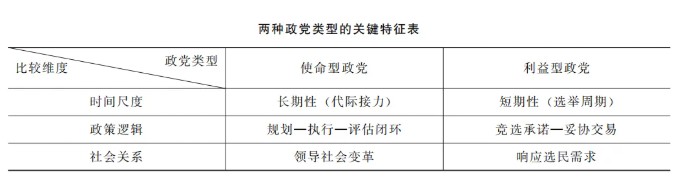 在近代中国历史大转型时期,各种政治主张和政治力量“你方唱罢我登场”。中国共产党成为中国革命和现代化建设的领导力量,与其作为“使命型政党”的特质密切相关。所谓“使命型政党”,是指以特定历史使命(如民族复兴、社会变革)为根本存在目的和行动纲领,通过高度组织化力量引领国家长期发展战略,其合法性源于使命履行效能而非短期选举授权的政治组织。“使命型政党”是相对于“利益型政党”概念而存在的政党形态,具有三个明显特征:历史使命的自觉承担、超越短期利益的长期承诺以及组织机制对使命的保障。“使命型政党”与“利益型政党”的差异参见下表。