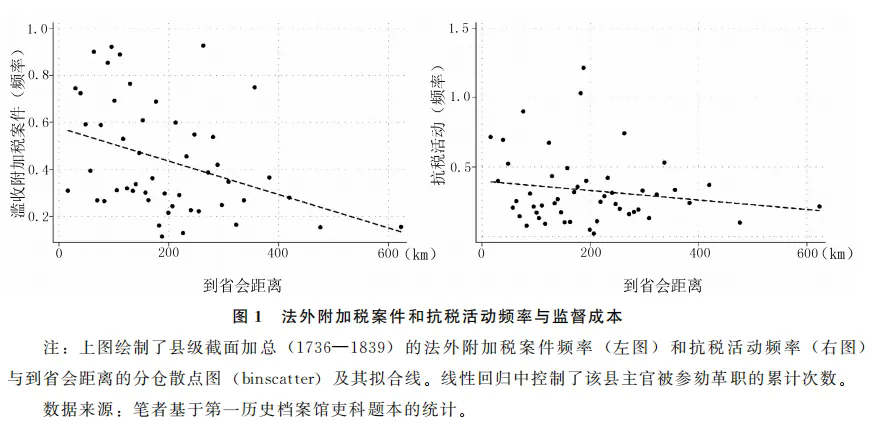 然而,信息和监督成本无法解释双轨财政体制的几个重要特征。首先,如果疆域广大和地方多样性是造成双轨财政的主要原因,地方政府的“预算外”收入应在距离省会最远的边陲地区最为突出,但经验证据表明,地方政府名目繁多的“预算外”收入普遍存在于各地。若以滥收附加税引发官员查处的案件频率度量各县法外附加税的流行程度,从图1可以看到,即使控制住实际监察力度的差异,附加税案件的数量反而在监督成本更低的县更多——“预算外”收入与到省会的距离负相关。法外附加税泛滥的另一面是更高的农民税负,可能激发更多的抗税活动,但抗税活动也并非更多发生在监督成本更高的地区。另外一个值得注意的现象,是腐败的“灯下黑”。就陋规而言,京官和笔帖式也能从“平余银”中获取不菲的收入。其次,地理因素无法解释地方政府的行政开支主要由“预算外”收入维持这一事实。外部性较低的地方公共品本应由地方政府列入预算支出,因为这些公共品具有较大的跨地区异质性,地方政府可以利用本地信息优势以更高的效率提供。而基础行政运转开支的年际波动较小,完全可以在“预算内”收入里划拨足额的经费。然而,在清代大部分时期,从省到州县的行政开支,大部分由“预算外”收入支撑。最后,上级政府对州县的监察失效,主要因为其开支依赖下属上缴的“预算外”收入因而缺乏有效监督的激励。事实上,为了解决监督问题,雍正建立了密折制度,授予部分高级军政官员跨过督抚直接向皇帝秘密奏报。然而,亏空正项、浮收勒折、捏灾虚报等现象并未得到有效遏制。