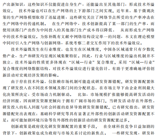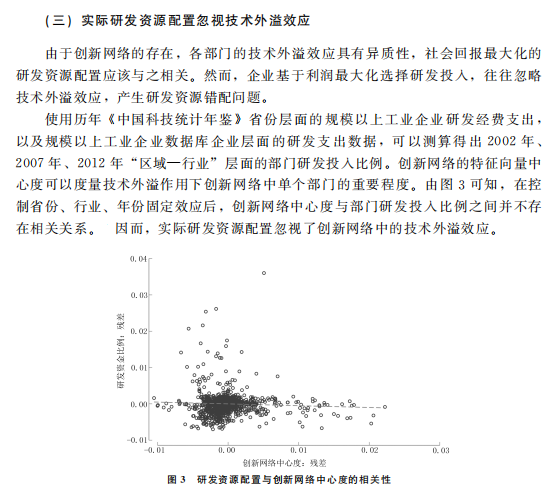 摘 要:由技术外溢引致的外部性,是创新活动相对于其他经济活动最重要的经济学属性之一,但创新政策的理论研究和实践设计常常将之排除在外。采用生产网络和创新网络分析方法可将技术外溢问题引入经济学分析,进而提升研发资源有效配置和最优创新政策设计的理论完整性与现实相关性。研究发现:我国在“区域—行业”维度的技术外溢显著存在,但企业的市场化决策未能将其纳入考量,引致研发资源错配,这为创新政策介入提供了合理性;中国研发资源配置效率自2010年后明显提升,创新政策在其中发挥重要作用。中国创新政策应更多关注技术外溢效应和细化政策工具组合,以更好发挥有效市场和有为政府的协同作用。