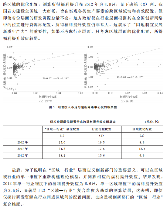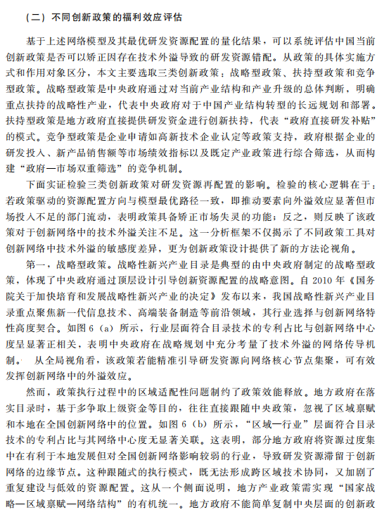 技术外溢视角下的研发资源配置效率难以直接观测,需要依托包含网络结构的一般均衡框架。当前的创新政策研究往往直接检验特定政策对企业创新活动的激励效果及其作用机制,将技术外溢排除在外,未能从宏观层面对创新政策进行系统性评估。为此,需要构建一个包含生产和创新网络的内生增长模型,纳入企业的微观决策行为,刻画部门间的技术外溢机制,量化研究存在技术外溢效应下的研发资源有效配置问题,为最优创新政策设计提供支撑。此外,从现实情况来看,中国产业空间分布呈现出鲜明的集聚特征,一个产业往往集中在少数区域,一个区域也只有少数产业处于网络核心节点。因此,需要依托“区域—行业”层面的生产网络与创新网络进行量化研究,由此评估我国创新政策如何引导研发资源配置,为细化创新政策工具组合提供学理依据。