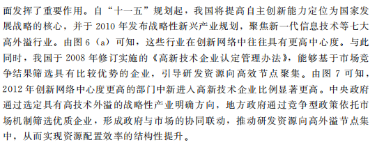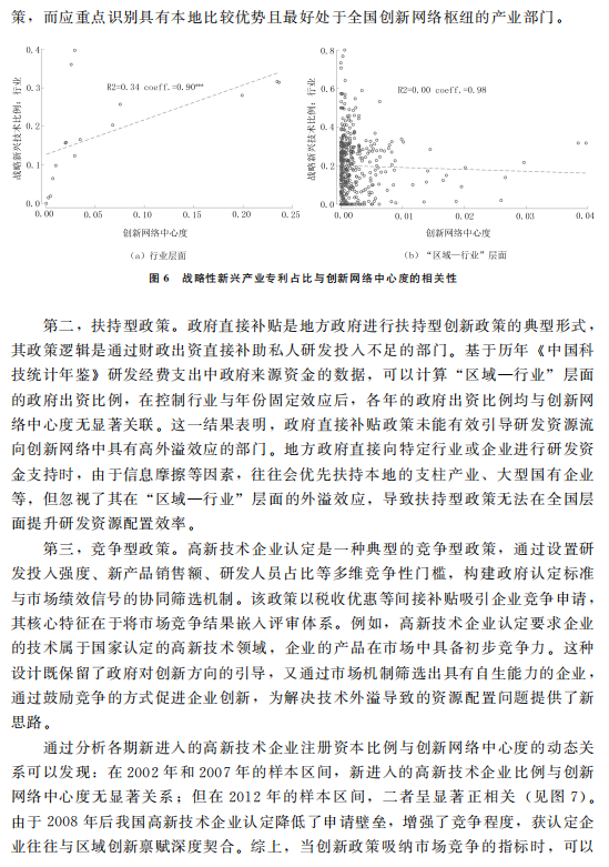 基于技术外溢视角对三类典型创新政策的评估表明,有效的创新政策需要有效市场和有为政府的有机结合。首先,中央政府通过制定战略性新兴产业指导目录而选择的产业具有高度的技术外溢,但如果地方政府忽略所在区域的比较优势,将难以实现研发资源配置的优化。其次,地方政府针对特定行业或企业的直接研发资金支持,对部门间的技术外溢关注不足,此类政策还有优化空间。最后,政府在实施高新技术企业认定等竞争型政策过程中,采用了体现市场机制的多维度指标,提高了企业竞争程度,实现了政府与市场的有机协同。2010年后新进入的高新技术企业更多集中在创新网络中心度高的区域与行业,由此实现了研发资源配置效率的提高。