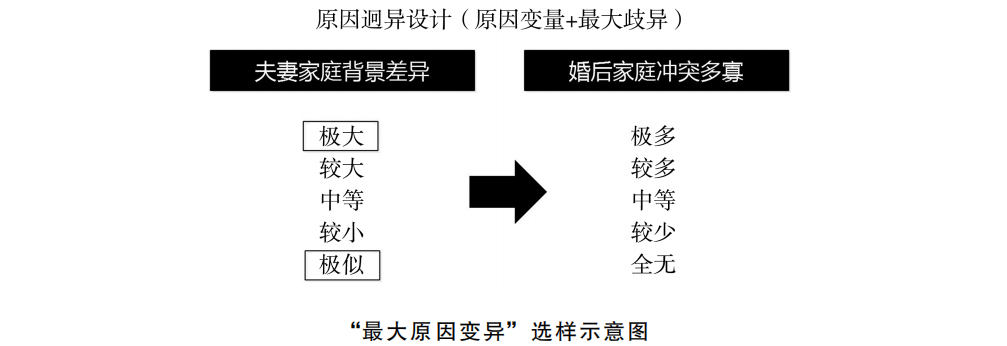 4.若能选择少量样本——多在10—30例之间,而非前述仅2—3例——此时如何选样?笔者也就《设计》提示的原则,推荐如下三种选样设计。(1)“最大案例变异”设计(maximum variation sampling)。即为纳入更多可能变异(避免“遗漏变量”概率),应尽量在所有“可能关键变量”(包括原因、结果与控制变量)的变化类型上尽可能抽取极端变异的案例,其逻辑与“分层随机抽样”类似。举例而言,研究者可能怀疑“教育水平”与“家庭地位”都会影响案例的工资收入,于是可在不同变量的不同状况上都进行选样,以获取“最大案例变异”选样。(2)“最大原因变异”设计。即虽然不可基于“结果变量取值”选样,却能根据“原因变量取值”进行选样,其选择标准是尽量纳入原因变量极端取值的案例。如此不但不会造成“删节样本”式的误导,还能减少所需案例数量——只需选择取值极端,无须纳入中间取值案例——从而增加研究的效率。举例而言,若想验证“门当户对”是否有助“婚姻和谐”,可就夫妻家庭背景差异极大与极小者,各选数例验证即可(如下图所示)。(3)为能控制干扰变量影响,也可仿效前述“最似比较”设计,将相近案例归类群组,做成“队列—区域研究”(cohort study/area study)设计。前者如“青年研究”,后者如“拉美研究”,做法都是将背景相近的案例组团研究,就能帮助控制案例“类似条件”的影响。这也就是学者常说的“别拿橘子同苹果相比”,要“橘子与橘子比,苹果与苹果比”,才更容易确认所持的因果假说。