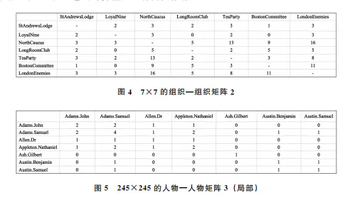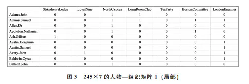 矩阵1(图3)很简单,是对这份名单的二值化表示,体现了人和组织的关系:可以看到塞缪尔·亚当斯属于一个叫作“北部核心”(North Caucus)的组织,同时还属于“长厅俱乐部”(Longroom Club)。从这个矩阵中我们只能知道人和组织的单向联系。该如何发现这些组织之间,乃至人和人之间的关系?