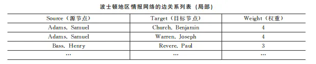 至此可以说,社会学家是在对此人的传记信息一无所知的情况下——不知道他的信仰、他的写作、他的私生活种种,而仅仅利用了他参与组织的信息,便发现了他在情报联络中肩负的至关重要的桥梁作用。而这些元数据之所以可以起到“四两拨千斤”的作用,其实是通过把一个245×7的二模网络转换成了245×245的一模网络,再将节点的大小按所谓中介中心度(betweenness centrality)排序并做模块化计算得到的结果。具体而言,图5的矩阵被转化为了从源节点(source)到目标节点(target)的一条条用两人共同参与组织数来赋值的边关系列表。