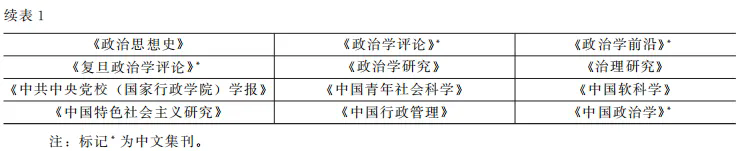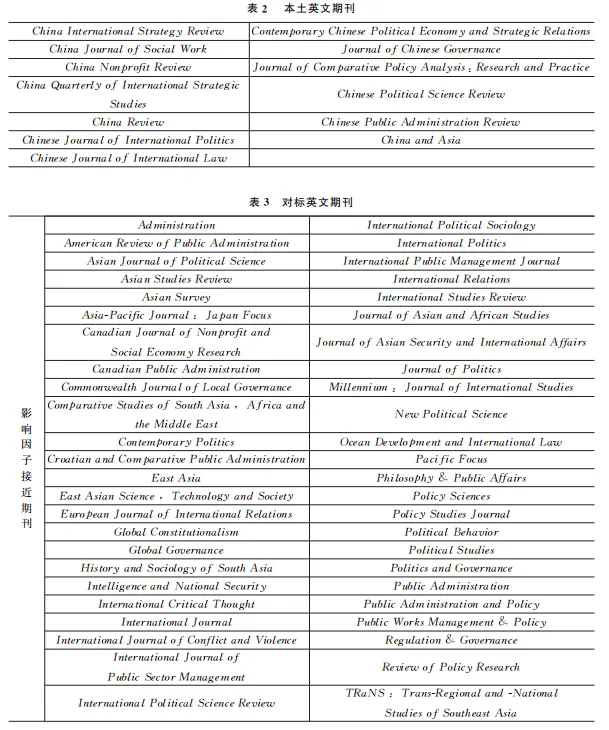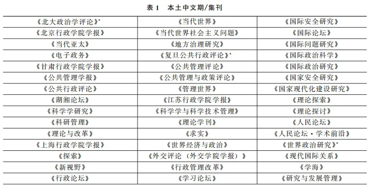(1)期刊选取:为了保证数据的代表性、权威性和针对性,分为国内机构主办的本土中文期刊和集刊、国内机构主办的英文期刊,以及对标英文期刊(非国内机构主办)三类呈现,以上三类分别简称为“本土中文期/集刊”“本土英文期刊”“对标英文期刊”。本土中文期/集刊部分,选取同时为AMI核心与CSSCI的政治学与公共管理学期/集刊,共57本,其中期刊50本,集刊7本;本土英文期刊部分选取Scopus收录、国内机构(含港澳,不含台湾地区)主办的政治学与公共管理学,共13本;为比较国际政治学与公共管理学发展情况,本文还选取与本土政治学与公共管理学影响因子接近(48本)以及政治学与公共管理学顶尖期刊(7本)进行分析,共55本。以上三类共选择期刊125本;具体目录见表1、表2和表3。(2)文献检索:本文将检索的出版年度范围设定为党的十八大以来,具体文献数据采集时间范围为2012年1月1日至2025年1月10日。(3)数据清洗:本文对检索获得的文献进行了筛选整理,手动剔除了无意义的投稿要求、访谈、报道等文章,分别在以上三类期刊中获得78314、2890和27847篇有效文章。