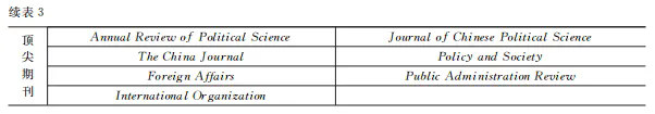 为保持与前文分析的逻辑一致性,本文关注研究者的国别维度,简要分析中国学者和国外学者在不同类型学术期刊上进行知识生产与传播的分布格局(见表6)。针对本土中文期/集刊,本文依据作者姓名识别是中国作者还是国外学者;针对本土英文期刊和英文对标期刊,本文则根据机构属地判别,将署名机构通信地址不在中国大陆或港澳台地区的作者视为国外学者;反之则视为中国作者。首先,就国外学者在本土中英文期刊上的发表情况,国外学者在本土中文期/集刊中的参与度(即参与发表的文章数量占文章总数之比)较低。排除译作,所列期刊在统计期内仅有634位国外学者,参与发表文章568篇,仅占文章总量的0.72%,且主要集中在《当代世界》《政治思想史》等期刊。在本土英文期刊中,国外学者参与度较高,共发表1786篇文章,占文章总数的61.80%。其中,美国学者参与发表文章522篇,占18.06%。其次,就中国学者在本土英文期刊和对标英文期刊上的发表情况,中国学者在本土英文期刊发表文章1480篇,占文章总数的51.21%。相比之下,中国学者在对标英文期刊中的整体参与度为6.84%,明显较低;其中大陆作者占比最高为4.58%,香港作者占比为1.57%,台湾作者占比为0.99%,澳门则为0.12%。