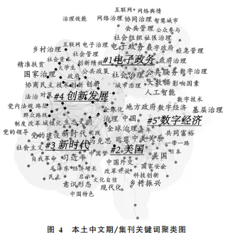 党的十八大以来,本土中文期刊与集刊的研究主题呈现多元化发展趋势。从CiteSpace生成的关键词聚类图(图4)中可以看出,研究主题主要集中在五大领域:“电子政务”“美国”“新时代”“创新发展”和“数字经济”。图示中的关键词节点大小反映了关键词的出现频率,节点越大说明该关键词在所分析的研究中越重要;而关键词之间的连线与密集度则揭示了研究主题之间的关系紧密程度。