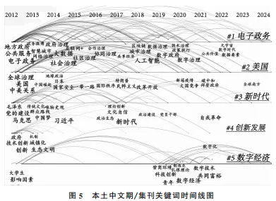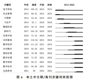 从时间维度上看,各主题在时间线上的演化趋势如图5所示。关键词之间的连接线越多,说明该领域研究的关联性和活跃度越高。热度高的主题关键词在时间线上分布密集,且持续出现在多个年份中。其中,“#1电子政务”主题的研究从2012年开始关注地方政府和公共服务,随着数字技术逐步成为公共治理的基础设施,数据治理本身和智慧城市等新概念被逐渐引入;而2020年后,元宇宙等新兴技术和概念又被引入公共治理领域,并推动了人们对数字政府的讨论。而“#2美国”这一主题的研究热度则明显是在2016年特朗普第一次当选美国总统时开始迅速增加的,此后中美关系及全球治理等关键词频繁出现,反映了国内学术界对国际政治、国际关系的密切关注。而“#3新时代”这一主题的讨论热度则贯穿党的十八大以来迄今的整个时间线,文化自信、理论创新等关键词始终占据重要地位,体现了中国特色社会主义理论发展的连贯性与理论引领作用。“#4创新发展”主题呈现从城镇化与生态文明向技术创新和经济增长逐步延伸的趋势,反映了创新驱动在推动经济高质量发展中的核心作用。在2012年前后,图 6本土中文期/集刊关键词突现图 该主题的研究主要围绕城市治理、基础设施建设展开;随着创新驱动发展战略的提出,数字化逐渐成为研究热点,反映了创新在推动经济结构调整和可持续发展中的核心作用。“#5数字经济”主题在2015年之前的研究体现得较少;但在2018年后,数字技术、未来产业等该主题下的关键词在文献中迅速增加;而2020年后,该主题的研究焦点进一步转向共同富裕与社会创新,揭示了数字经济在学术讨论中逐步从技术到产业再到制度创新,不断深化的趋势。