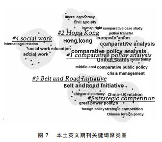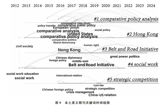 党的十八大以来国内机构主办的英文期刊的关键词聚类图凸显出五大主题:“#1比较政策分析(comparative policy analysis)”“#2 香港(Hong Kong)”“#3 ‘—带一路’倡议(Belt and Road Initiative)”“#4 社会工作(social work)”以及“#5 战略竞争(strategic competition)”(见图7)。“#1比较政策分析”主要体现了学者对中外政策过程和治理模式的国际比较的兴趣,其具体关键词涵括了政策转移、比较案例研究等。“#2香港”则是这一时期由于众所周知的原因而出现的热点主题,反映了该时期学者在英文学术媒介对中国香港特区政治及社会风波的集中关注。“#3‘一带一路’倡议”涵盖大国政治、中国外交等关键词,充分展现了“一带一路”倡议在学术界的讨论热度。“#4 社会工作”主题则主要围绕社会工作教育(social work education)展开,体现了学术界对社会治理与公共服务领域的持续关注。“#5战略竞争”主题则同样反映了人们在这一时期关注中美关系、外交政策等议题,体现了中国在相关领域里对国际战略格局变化的密切关注。