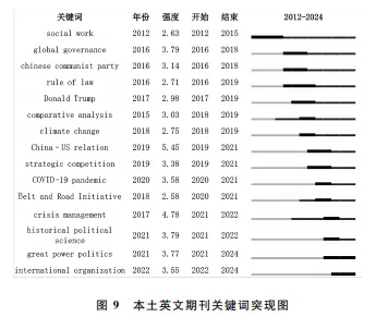 对标英文期刊的研究主题延续了国际政治学与公共管理学的经典议题框架,以“#2气候变化”“#3国际贸易”“#5公共行政”为代表,展现出其对全球性治理问题的持续关注。在这些期刊中,“中国”成为研究对象而非研究主体,其研究往往集中在中国的外交政策、经济战略或治理模式的外部影响,对数字治理、全过程人民民主等中国特色政治概念的关注度不高,凸显出西方主流期刊在议题设置上仍以西方经验为参照。对标英文期刊主要服务于国际学术主流,议题与理论多以西方经验和全球问题为中心。关键词突现分析进一步印证了这一点。“新冠疫情”“社交媒体”“冷战”等议题突现强度高,但多数聚焦于制度危机、舆论动员等议题,与中国本土在治理实践层面的研究取向差异明显。