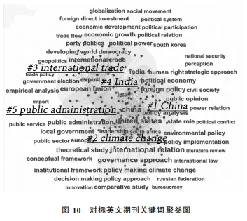 对标英文期刊的关键词聚类图(见图10)可以看出,自从2012年以来研究热点主要集中在:“#1中国(China)”“#2气候变化(climate change)”“#3国际贸易(international trade)”“#4印度(India)”和“#5公共行政(public administration)”。可见即便是在这些并非由中国本土机构主办的政治学和公共管理学期刊中,“#1中国”主题也是过去十多年研究的突出热点,其下关键词涵盖与中国相关的外交政策、全球战略、欧洲安全战略、中俄关系乃至日本等内容,涉及与中国和世界主要大国的关系,以及相应国际秩序重塑等方面。“#2气候变化”主题则聚焦于政策设计、政策扩散与环境治理等议题,涵括了“政策路径(policy approach)”“政策制定(policy making)”“政策分析(policy analysis)”等关键词,表明这些研究不仅关注气候变化的治理框架,还探讨了政策传播过程中社会结构和合作机制的重要性,关注全球气候变化治理中的实践路径。而在交代了前两个研究热点领域的背景后,“#3国际贸易”这一主题能够名列前茅就不难理解了,其下的“贸易政策(trade policy)”“外商直接投资(foreign direct investment)”和“经济发展(economic development)”等关键词揭示了在全球化体系发生重大变化时,学者对国际贸易政策、经济一体化、外商直接投资和发展中经济体等问题潜在变化的讨论。“#4印度”这个主题包括了“民主(democracy)”“社会运动(social movement)”“国家角色(state role)”和“人权(human rights)”等关键词,学者不仅关注印度国内政治制度、社会变迁和治理能力,还关注印度在区域和全球层面上的战略定位及其所扮演的角色。“#5公共行政”则是国际政治学与公共管理学的长期固有研究领域,涵括了“地方政府(local government)”和“公共部门(public sector)”等主要关键词,侧重于地方治理、公共服务和政策过程等议题。