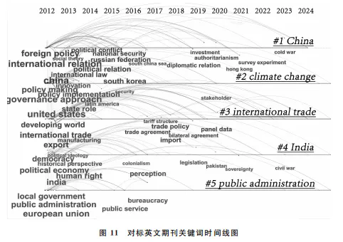 从时间维度来看,对标英文期刊的关键词特征如图11所示。“#1中国”相关主题在本文所考察的2012年后整个考察期内始终都占据核心地位,尤其在“一带一路”倡议提出后,与中国相关的外交政策、国际关系与地缘政治等研究一直都是学术界广泛关注的议题。“#2气候变化”主题同样贯穿整个考察期,研究主要聚焦于气候治理、国际合作与可持续发展等内容。“#3国际贸易”相关主题在2016年特朗普第一次当选美国总统后逐步升温,关键词涉及贸易政策、双边协议与经济影响等。而对“#4印度”主题的讨论,在2012—2015年期间关键词较少,主要是关于“民主”等议题的讨论;但在2016年后,该主题的研究活跃度增加,新的关键词如“主权(sovereignty)”“巴基斯坦(Pakistan)”“立法(legislation)”等开始出现。“#5公共行政”作为政治学公共管理学的一个主流话题,相关的关键词长期都有较高的讨论热度,涵盖地方治理、公共服务与政策执行等。