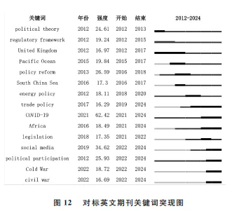 对标英文期刊的关键词突现分析呈现出几个鲜明特点(见图12)。第一,在2012年之后,较早突现的关键词为“政治理论(political theory)”和“监管框架(regulatory framework)”;这两个关键词是学科领域内的经典问题,不过“政治理论”的突现周期在2013年就结束了,而“政策改革(policy reform)”等关键词则成为重点。第二,2022年后,“社交媒体(social media)”“冷战(Cold War)”和“内战(civil war)”等突现,这与当时欧美内部的政治撕裂在时间上有较好的同步性。第三,出现了高强度的突现词,“新冠疫情(COVID19)”的突现强度高达62.42,远超其他关键词;而“社交媒体”的突现强度也高达34.62。 部分关键词在考察期内的突现时间较长,如“贸易政策”在2019年开始成为政策讨论的重点,“新冠疫情”相关内容则自2021年起在政策文本中凸显,并持续受到关注直至2024年(本研究的考察末期),表明这些议题具有更持久的学术影响力。