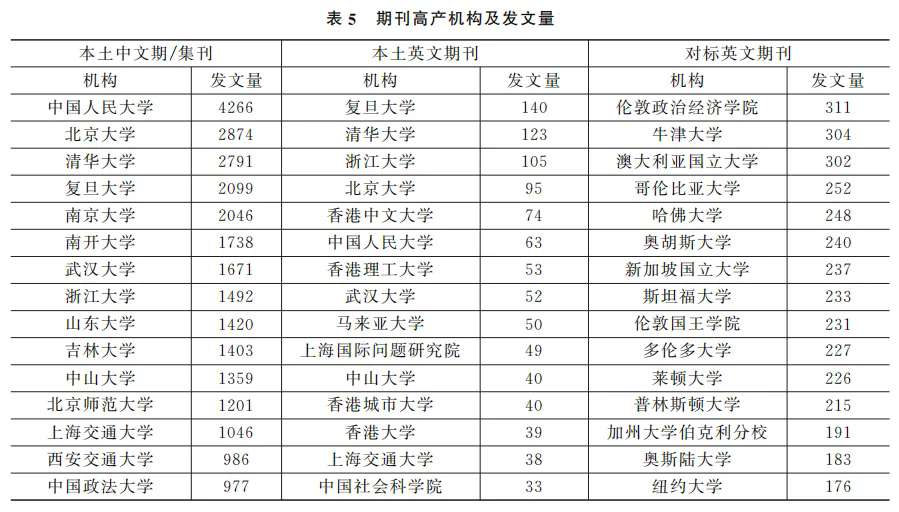 统计各类期刊发文量前15位的机构(见表5)。在本土中文期/集刊中,高发文量机构几乎全由双一流大学所主导,其中,中国人民大学不仅名列前茅,而且该校国际关系学院、公共管理学院、马克思主义学院均有较多产出。其他双一流大学之间则竞争激烈。在本土英文期刊中,复旦大学发文量居于首位,清华大学和浙江大学则分列第二与第三;而中国香港的大学以及马来西亚的马来亚大学也位列前茅。在对标英文期刊中,发文量最大的是英国伦敦政治经济学院,以311篇发文量位居榜首,牛津大学和澳大利亚国立大学则紧随其后,北美和欧洲多所高校,如哥伦比亚大学、哈佛大学及丹麦奥胡斯大学也显示出较高的学术产出水平,但整个亚洲只有新加坡国立大学能够入围前15。