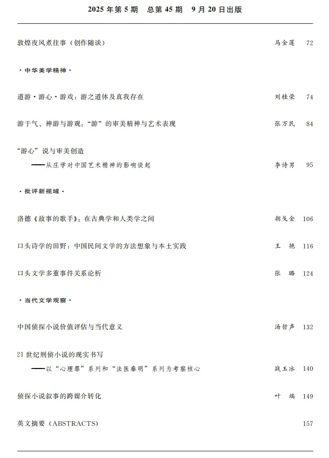 摘要:庄子将“游”从表示活动范围的游移,升华到精神自由逍遥、天地与我并生之义,成为中国思想史与美学史的核心范畴之一。“游”的自由超越境界,符合审美的本质;“游”的物我合一体验,符合审美的方式;“游”体现了美学的根本精神。“游”的审美精神落实在中国文学、绘画等艺术领域,则体现为:《楚辞》开启的“神游”文学,呼应了庄子的超越世俗与高蹈自由,更突出了“游”所隐含的理想与现实的张力;《列子》的“游观”哲学,深化了身游与神游、游目与游心的冥合,即身体与精神的辩证统一,这深刻影响了后世的山水空间表现。在中西比较的视野下,“游”与游戏理论的契合尤其受到关注,这有助于认识“游”的审美精神。