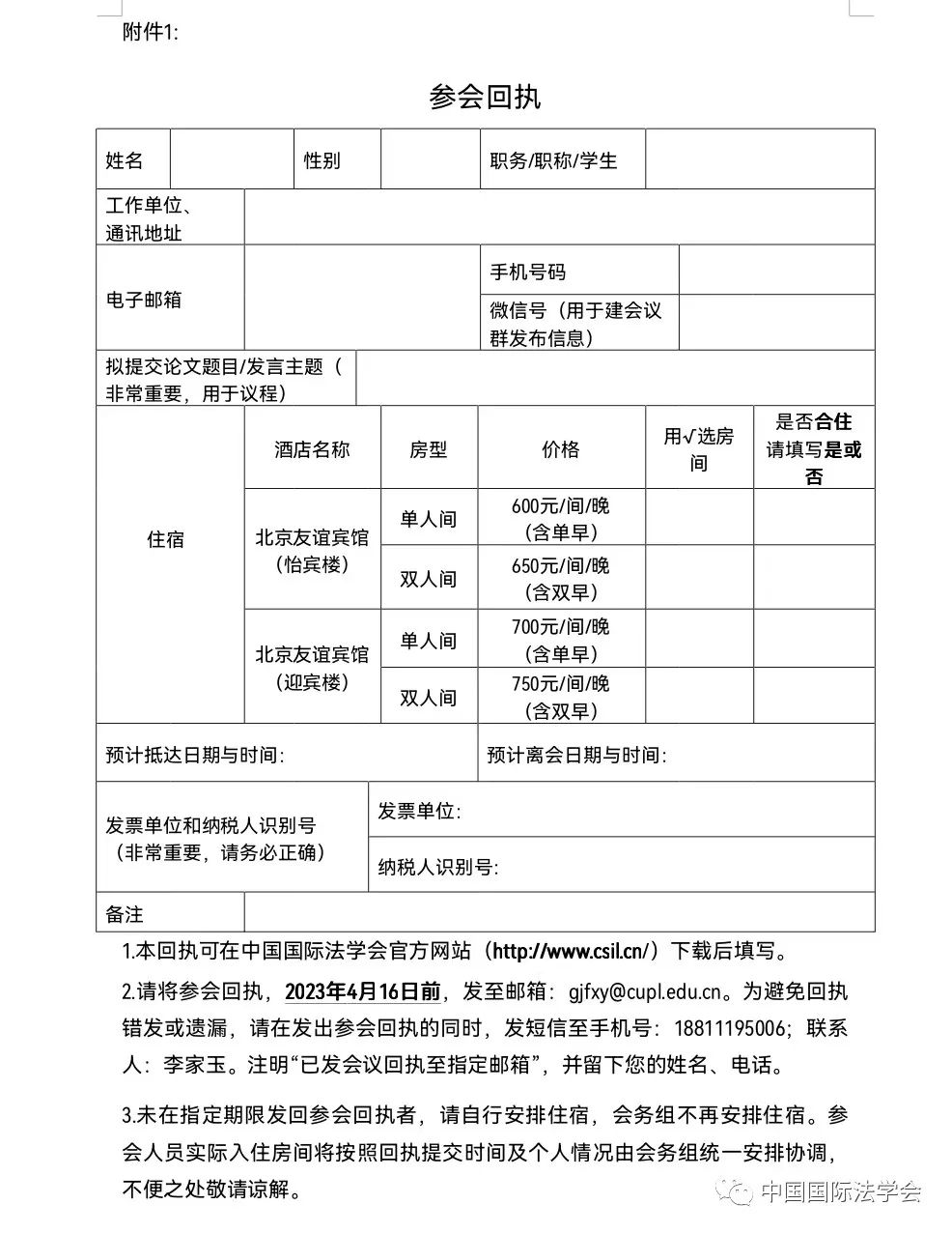 方式2:填写WORD版本参会回执(见附件1)。WORD版参会回执请发至邮箱:gjfxy@cupl.edu.cn。为避免回执错发或遗漏,请在发出参会回执的同时,发短信至手机号:18811195006;联系人:李家玉。注明“已发会议回执至指定邮箱”,并留下您的姓名、电话。
