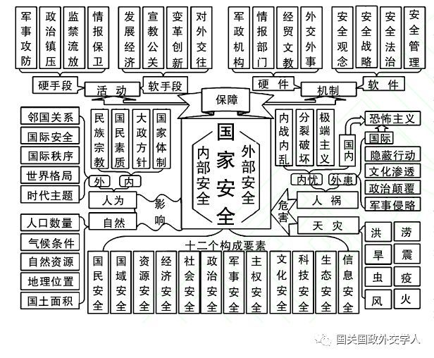 《国家安全学》将整个国家安全体系分为四个基本方面:一是国家安全的构成要素,二是影响国家安全的因素,三是威胁危害国家安全的因素,四是国家安全保障体系。后来,又对四个方面中的具体内容进行不断调整、丰富和完善,最终形成下图所示的当代国家安全体系。