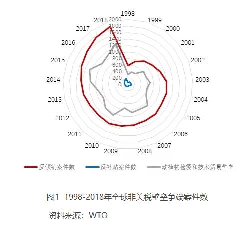 近年来,逆全球化思潮涌动,国际保护主义和单边主义势头上升,世界经济贸易发展特别是制造业发展面临的国际经贸环境趋于严峻。如美国退出泛太平洋战略经济伙伴关系协定(TPP),推出对海外跨国公司征税、限制移民、启动对华301条款调查等多项带有强烈贸易保护主义色彩的举措,欧盟各成员国投票同意对现行反倾销和反补贴规则进行改革,为欧盟单方面实施贸易保护创造条件。在这种背景下,长期以来一直顺风顺水发展的经济全球化进程遭受了严重挫折,全球贸易争端明显增多。据统计,从1998年至2018年,全球反倾销争端由583起增加至1860起,全球反补贴争端由52起增加至178起,动植物检疫和技术贸易壁垒争端则由296起增加至1316起,均呈现出明显增加之势(见图1)。