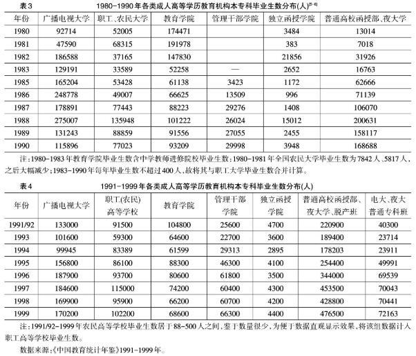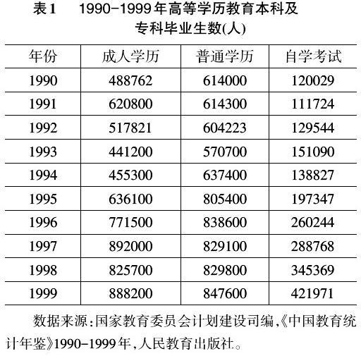 20世纪90年代,从整体上看每年取得高等学历本科及专科毕业生数稳步增加,1999年毕业生总数超过215万,成人学历与普通学历的毕业生数大体相当。1990-1994年,普通学历毕业生每年稳定在60多万人,1995-1999年该数字稳定在80多万。自学考试毕业生数变化情况与普通学历比较类似,虽然总数较少,但是比较稳定,且总体不断增加。相比之下,成人学历毕业生数在这段时期存在少许波动(见表1)。