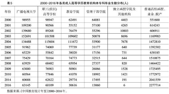 进入21世纪以来,每年从普通高校取得成人学历资格证书的毕业生数远超其他五类成人高等教育机构毕业生总数,从表5所显示的幅度差距可见,普通高校举办的成人高等学历教育毕业生规模之大,已使其几乎足以脱离于由其他五类独立设置的成人高等教育机构所构成的成人高等教育系统。2006年普通高校的成人高等学历毕业生数陡然跌入64万低谷,在2007年又陡增至150万,2016年继续增至228万(见表5)。