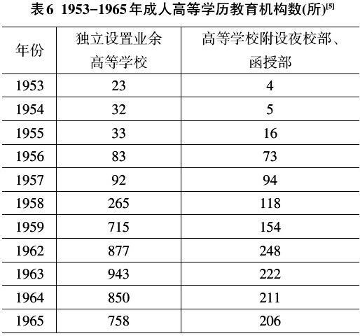 从1953年起,除了普通高校举办的函授和夜大学,国家还通过专门设立的业余高校向各行业在职人员提供高等学历教育。1956年至“文革”前,独立设置的业余高等学校得到较快发展,尤其是在“大跃进”的社会背景下,独立设置的业余高校于1958-1965年间在各地迅速新建。1982年,教育部专门印发针对职工大学、职工业余大学学生的学籍管理暂行规定和考试试行办法,要求这类院校毕业生学完教学计划规定的课程后,都要进行毕业设计(毕业论文)和毕业答辩,成绩合格者可获得所学专业的毕业证书。[3]1984年3月,教育部、国家发展计划委员会将“纳入国家成人高等教育事业计划的范围”明确限定为:“经省、市、***人民政府和中央有关部门批准,并报教育部审定备案的广播电视大学、职工高等学校、农民高等学校、管理干部学院、教育(教师进修)学院、独立设置的函授学院、普通高等学校举办的函授部、夜大学,招收具有高中毕业文化程度,学制为二年以上,培养目标相当于高等学校专科和本科毕业水平的人数,不包括在各种短期训练班、进修班学习的人员。”[4]从1986年起,各类成人高校实行全国统一招生。②
