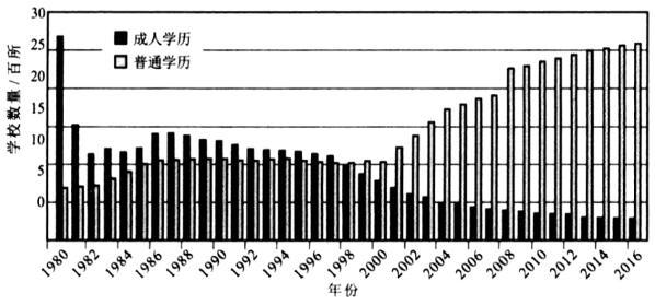 图3 1980-2016年全国成人高校与普通高校数量变化