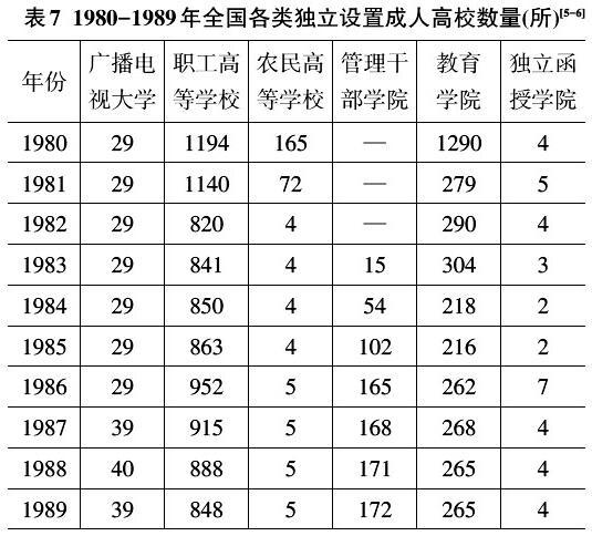 20世纪80年代,职工高等学校是全国数量最多的独立设置的成人高校,主要面向企业在职员工。其次是教育学院,其总数在1980-1981年间从1290大幅减至279所,之后总数基本保持稳定,它主要面向中小学校在职教师群体。管理干部学院创立于1984年,专门面向企事业单位的管理干部群体。广播电视大学1980年有29所,到2002年发展到45所。独立函授学院自1980年起仅剩4所,截至2002年仅剩2所。农民高等学校主要面向农民,1980年有165所,1981年减至72所后基本停办,1982-2002年全国每年只有3所左右。[5-6]