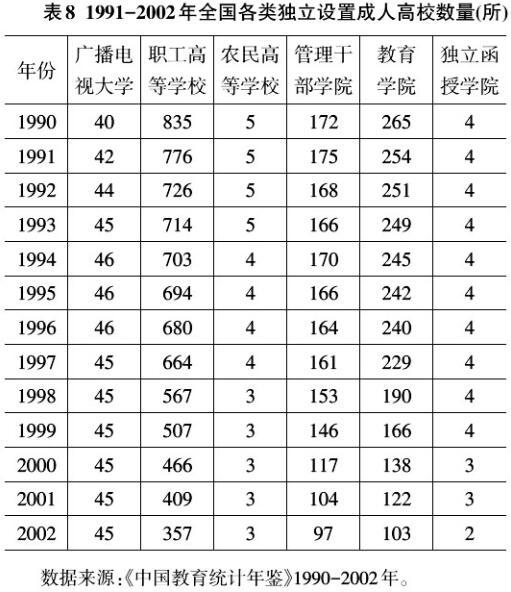 20世纪90年代至21世纪初,由于农民高等学校和独立函授学院数量仅剩2—3所,这段时期独立设置的成人高校主要由职工高等学校、教育学院、管理干部学院以及广播电视大学这四类专门机构构成(见表8)。广播电视大学数量基本保持不变,管理干部学院数量减速较缓,教育学院次之,职工高等学校减速最为显著,1990-2002年间由835所减至357所,减幅超过57%。