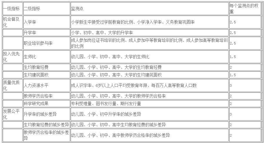 教育质量不仅能反映教育发展水平的高低,也能反映教育活动达到预期效果的程度,主要包括学生发展、教师队伍、教育成果等方面。衡量教育质量的指标主要包括学生学业成绩、人力资源水平、教师学历合格率、高级职称教师比例、科学研究成果等。本研究选择人力资源水平、教师学历合格率、科学研究成果等3个二级指标的11个监测点反映教育质量。人力资源水平反映学生培养质量;教师学历合格率反映教师队伍发展质量;科学研究成果反映教育科学研究质量。