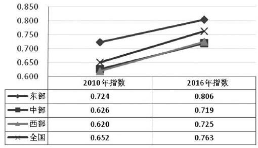 图3 2016年与2010年东、中、西部地区教育现代化发展指数