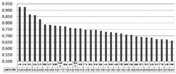 本研究对我国31个省(***、直辖市)教育现代化发展指数进行了分析。研究发现,2016年我国各省(***、直辖市)教育现代化发展指数从高到低依次排列如下:上海市、北京市、浙江省、天津市、江苏省、陕西省、辽宁省、***吾***、内蒙古***、福建省、吉林省、黑龙江省、青海省、广东省、湖北省、甘肃省、重庆市、山东省、海南省、山西省、宁夏回族***、湖南省、安徽省、西藏***、四川省、河北省、江西省、贵州省、广西壮族***、云南省、河南省(见图4)。教育现代化发展指数最高的上海市(0.926)比最低的河南省(0.663)高0.263。