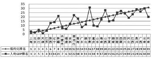 经济发展为教育提供物质基础和转化平台,教育发展为经济发展提供智力支持和人才支撑。当教育发展水平超越经济发展水平过多时,就会出现“教育过度”现象,造成社会资源的浪费;当经济发展水平超越教育发展水平过多时,经济的发展将会受制于人力资源短缺的“瓶颈”之中,难以可持续发展。(12)因此,教育与经济协调发展十分重要。只有当教育发展与经济发展之间保持宏观协调的状态时,一个地区才能实现可持续的经济增长和教育现代化的不断改善,才可以互相促进、健康发展。(13)然而,现实情况是,一方面我国区域经济发展水平很不平衡;另一方面,我国各地区教育现代化发展水平也很不平衡。本研究将各省(***、直辖市)教育现代化发展水平排名与经济发展水平排名进行比较,从二者排名的一致性来分析教育现代化与经济发展的协调性。
