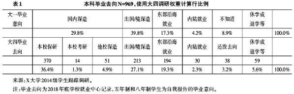 本研究使用一所研究型大学本科生的追踪调研数据和学业表现记录,考察大学期间学生毕业去向的演变、不同毕业去向学生大学期间的学业表现和学业投入以及这些学生毕业之际的问题解决能力、批判性思维能力和深造动机。本研究以风险规避理论为指导,确认研究型大学学生在面临出国深造、本校保研、东部沿海地区就业这三个主要毕业去向时,本校保研成为了学生不成文的安全“备胎”选择;[9]更重要的是,本校保研的学生院系内排名最优,但大学期间的学业投入却相对保守和求稳,毕业之际批判性思维和解决问题的能力也显著弱于出国深造和他校深造的学生。这一结果严重质疑当前保研制度的选拔标准对于培养和选拔创新人才的有效性;同时,保研学生深造动机的结果也质疑研究型大学超高比例的保研制度是否过度和过早吸纳本科学生读研。