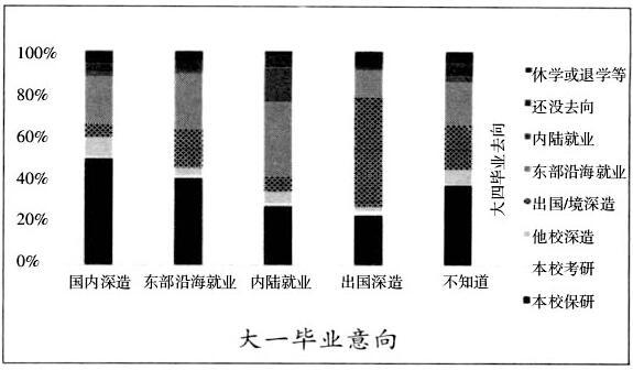 虽然存在海内外一流大学研究生学费差异等因素,超高比例研究型大学本科毕业马上攻读研究生这一现象值得探讨。特别需要指出两点:第一,大一毕业意向东部沿海就业、无明确计划的学生大量转为本校保研:第二,后文报告的保研学生深造动机,首要是增加就业竞争力,其次为了解自己,改变毕业去向初衷而本校保研的学生尤其如此;正如后文的讨论,我们不得不质疑保研制度是否过早吸纳了本科学生读研。