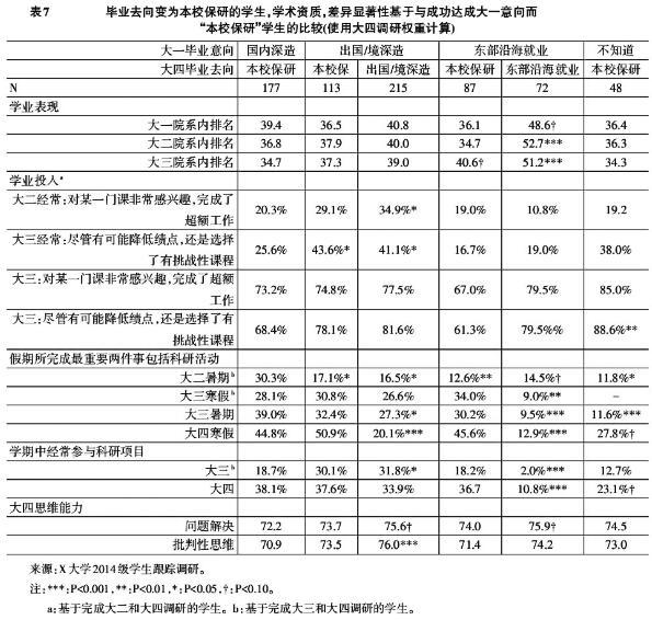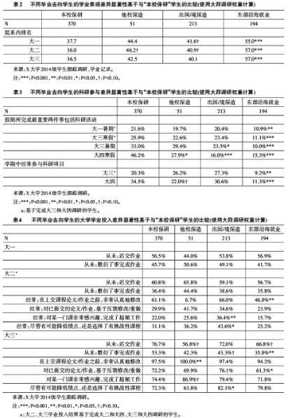表2报告了不同毕业去向学生大学期间的院系内排名,表3、表4、表5、表6报告了这些学生的学业投入情况、科研参与和问题解决能力、批判性思维能力。简明起见,表中仅包括了三类主流去向的学生,此外也包括了他校深造的学生这一具有参考意义的类别。结果表明本校保研学生院系内排名最优,科研参与比例最高,但大学期间的学业投入却相对保守和求稳,毕业之际批判性思维和问题解决的能力也显著弱于出国深造和他校深造的学生。