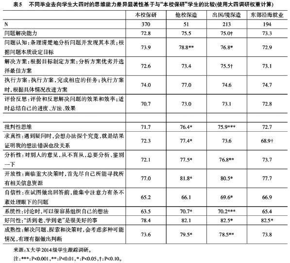 从学业投入和毕业之际的思维能力而言,本校保研的学生并非最为优秀。本校保研的学生大学期间对待课程作业的态度和出国/境深造学生基本没有差异,然而出国/境深造学生大二时经常性“超额工作”、“选择有挑战性课程”的比例显著高出很多,出国/境深造学生大三时“选择有挑战性课程”的比例依然显著更高。他校深造学生的学业投入情况似乎也比本校保研学生更好,大三超额工作的比例甚至显著更高(见表4)。①同时,毕业之际,本校保研学生解决问题、批判性思维能力在四类学生中最低,并且显著低于出国/境深造学生和他校深造学生。②必须指出的是,本校保研学生批判性思维能力具体题项均低于出国、境深造学生和他校深造学生,而且基本都达到显著性(见表5)。