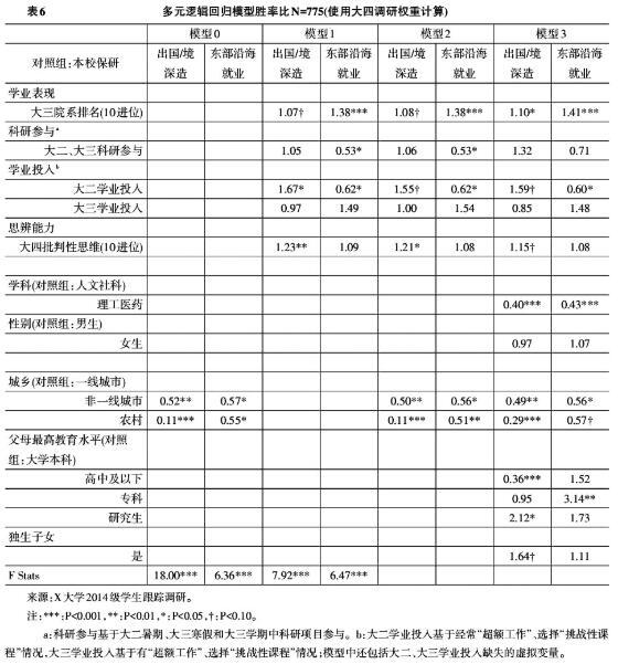 值得提出的一点是,模型3的结果表明,来自非一线城市和农村的学生出国深造的可能性是本校保研的1/2和1/3,东部沿海就业的可能性是本校保研的60%左右。不可否认,这个结果相当程度要归因于本研究模型缺乏家庭经济收入方面的变量。然而,即使考虑到财务方面、甚至户籍方面的限制,模型系数反映出这些学生对本校保研这个风险最低的毕业去向的强烈偏好,似乎也印证了弱势群体更倾向于规避风险的实证结果。