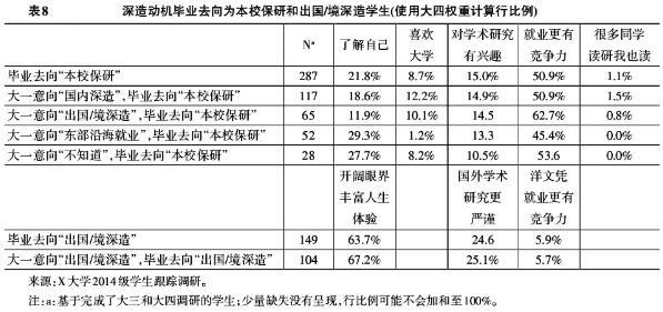 与英国和美国一流大学本科生相比,以上结果表明我国研究型大学本科生深造有两个基本特点:第一,本科毕业立即攻读研究生学位的学生比例非常高;第二,本校保研比例相当高。从教育期望而言,美国一流大学本科毕业生80%-90%计划完成研究生教育,然而仅30%左右本科毕业马上攻读研究生。[39][40]本研究案例中大学2014级学生毕业时88%预期完成研究生教育,这一比例与美国类似,然而70%学生本科毕业立即攻读研究生。而且近几年来我国绝大多数前“985”高校至少60%的本科生都选择了毕业后马上深造,其中包括40%比例的国内深造,[41]且以本校保研为最重要的方式。[42]