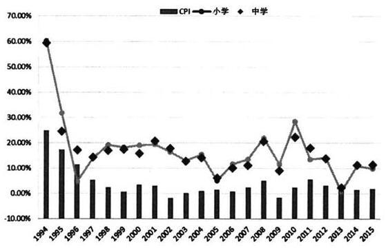 图1 1994-2015年北京市中小学教师名义平均工资增长率与CPI增长率