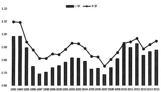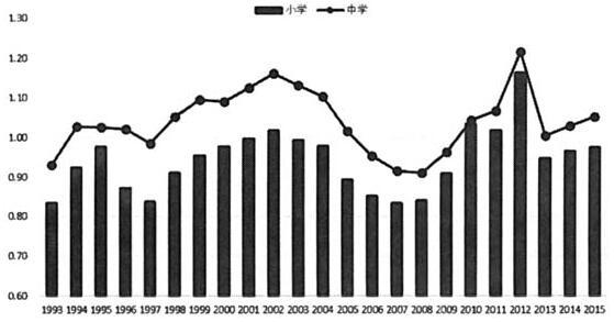 图4 1993-2015年北京市中小学教师与在职职工平均工资比值