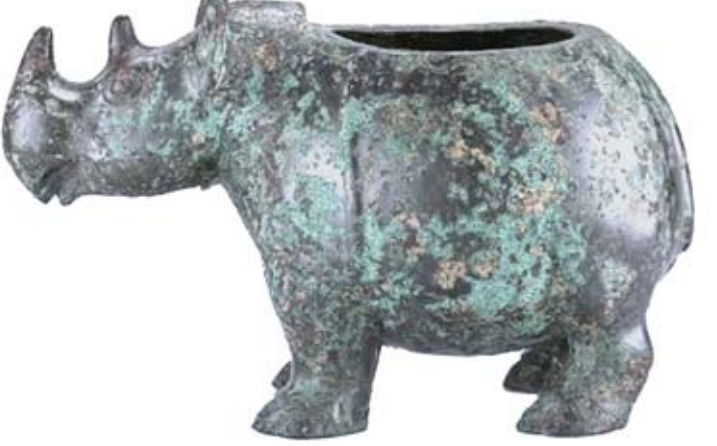小臣艅犀尊是商代晚期的青铜器,属鸟兽尊,为盛酒器,尊长37厘米,高23.2厘米。整器以犀牛为原型制作,犀牛腹部呈圆球形,腹内中空,为容器,上方有圆口,从口部看应有盖子,现已佚失。腹下有四条粗壮短蹄足,蹄为三趾,头部前伸,两眼圆睁,大嘴微张,鼻的上部竖立一尖状角,额上也有一角,两只大耳朵竖在头的两侧。器物运用写实手法,不事雕琢,表面无纹饰,仅有斑驳的铜锈覆盖。小臣艅犀尊在国际上享有较高知名度,许多有关青铜器的学术书刊都把其视作中国青铜器的象征,刊登在书的封面上。