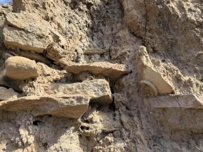 遗址断崖处裸露石墙及瓷碗底