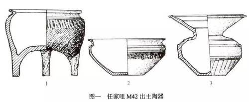 从这些楚文化风格遗物的出土背景来看,它们都不是独立成组地出现的,而是零星地、偶然地与典型秦文化风格器物共存于同一座墓葬中,看不出其受到特别重视,占有重要地位的迹象。如任家咀M42的柱足鬲与典型的秦文化陶器盂和喇叭口罐同出(图一);华县东阳M62的仿铜附耳球腹陶鼎也与典型的秦文化陶器盂和喇叭口罐同出,与铜剑M17:1同出的墓内随葬品是典型的秦文化陶器壶、鼎、喇叭口罐、簋、豆、盆、甗、囷等。迄今为止,在秦国范围内尚未发现典型楚文化风格墓葬及与之相伴的成组楚文化风格遗物出土。