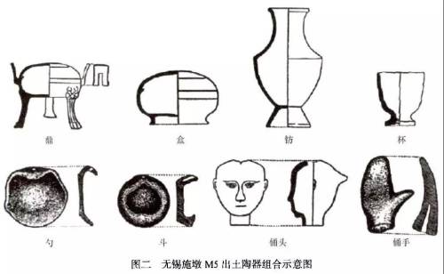 江苏无锡施墩五号墓,为一长方形竖穴土坑墓,出土器物包括黑胎陶鼎2、黑陶簋(盒)1、陶纺2、黑陶杯2、陶钵(勺)2、陶碟(斗)2、陶俑2件等(图二)。