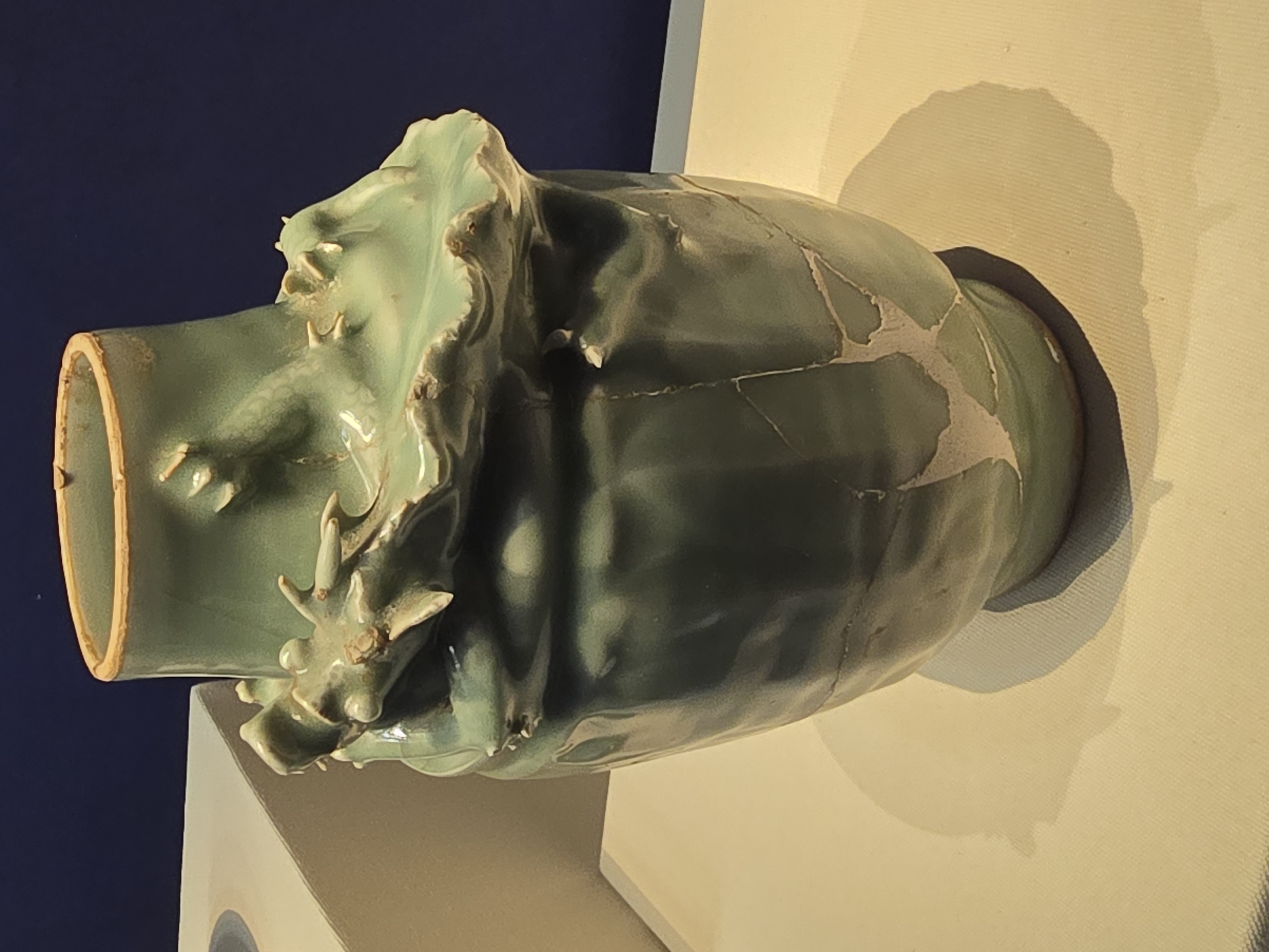 南宋粉青釉刻莲刻瓣纹堆塑龙纹瓷瓶 本网记者李永杰/摄
