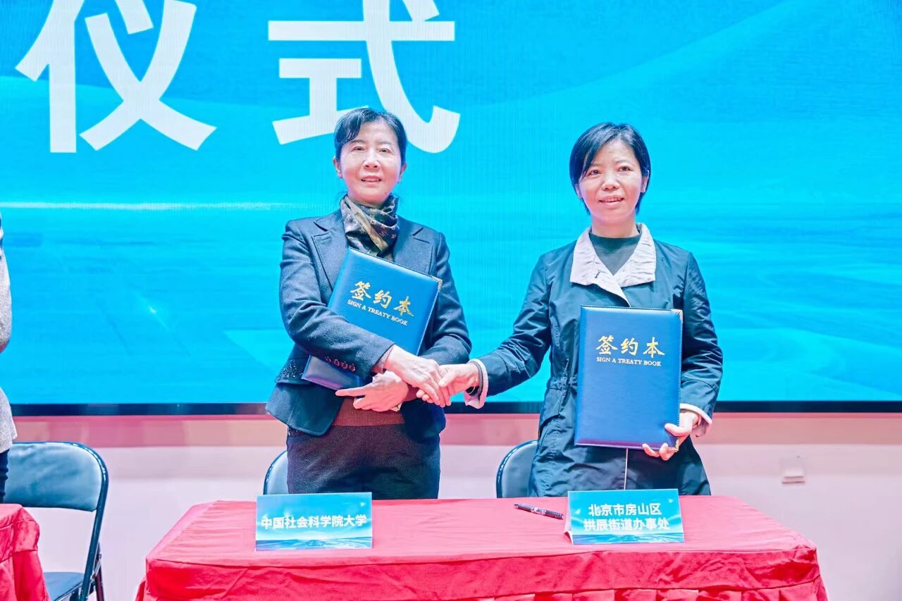 中国社会科学院社会与民族学院执行院长赵一红与北京市房山区拱辰街道办事处工委副书记谢美玲签约