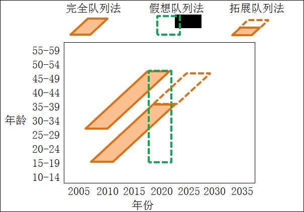 图1完全队列法、假想队列法和拓展队列法(以总和生育率为例)