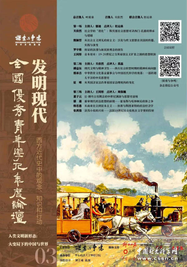 中国社会科学网上海讯(记者 查建国 陈炼)由《探索与争鸣》编辑部主办,华东政法大学外语学院承办的“发明现代:西方近代史中的观念、知识和行动——全国优秀青年学人年度论坛之八”学术研讨会近日在线上召开。本场论坛聚焦“观念、知识和行动”,探索在西方近代史上,欧美各国的有识之士如何从紧迫的现实问题出发,在思考与辩论中尝试勾勒出具有现代性特征的政治、经济和社会图景。