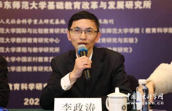 教育部人文社会科学重点研究基地华东师范大学基础教育改革与发展研究所所长、全国教育基本理论学术委员会主任委员李政涛教授作交流发言 本网记者 查建国/摄